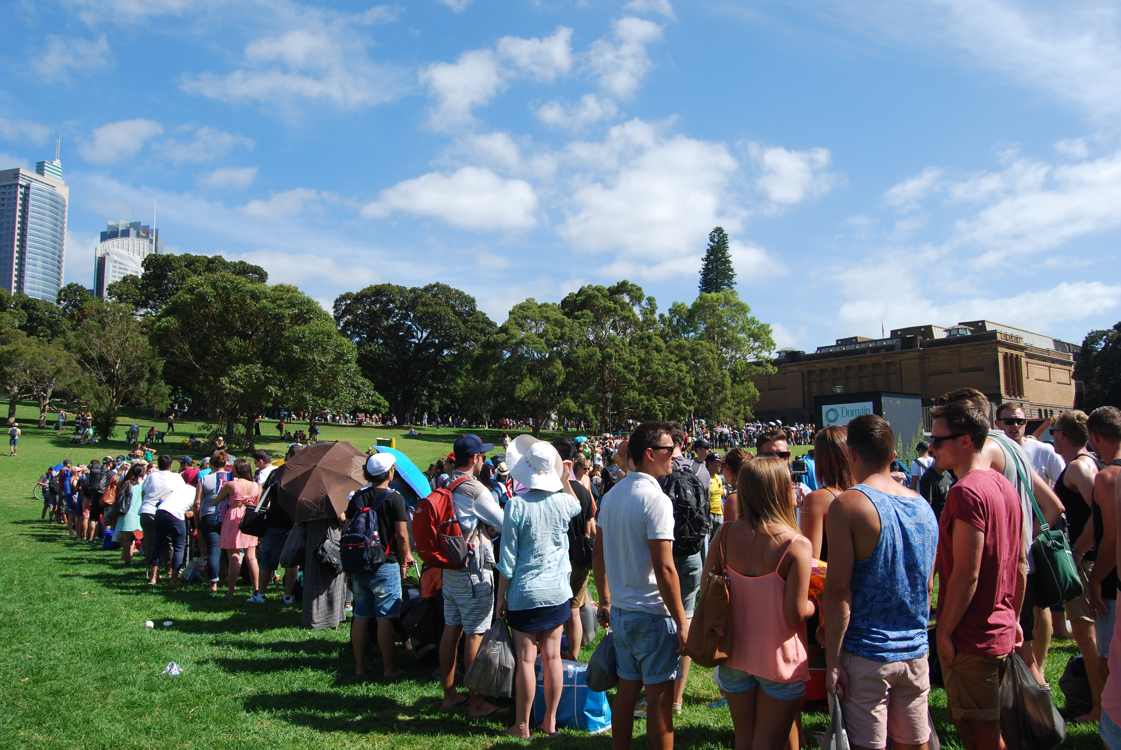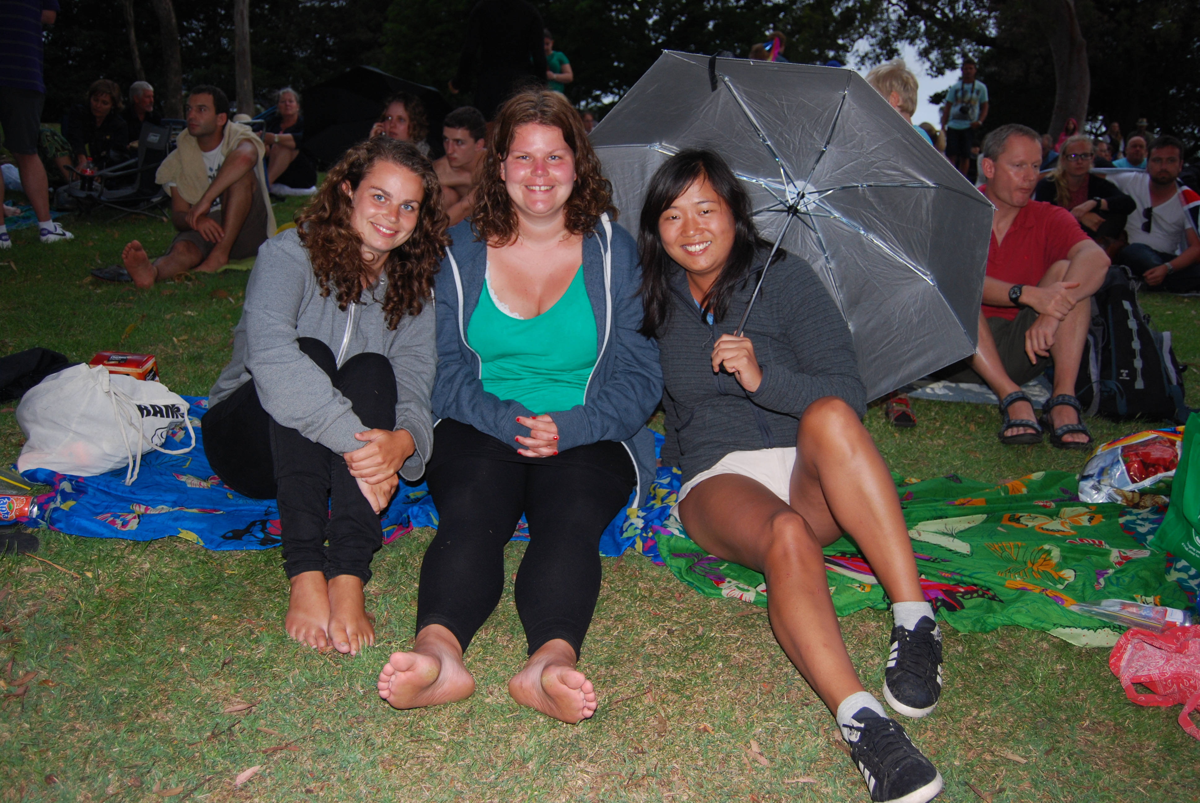 At 8.30 a.m., we (the Dutch sisters Yvette, Chantal and I) arrived at the main entrance of the botanical gardens. This is the place in Sydney to see the fireworks at New Year’s Eve. We were certainly not the first ones to arrive. Some people camped out to get the best spot. The waiting line was a few kilometers long and comparable to the snake of the game Snake on the old Nokia mobile phones. The atmosphere was very relaxed. Kudo’s to the organisation for that. There were not that many security guards or fences. But there was a kind of social control going on. People who tried to squeeze in, were asked to wait at the end of the line.  After 4,5 hours of waiting, we finally got in. We found a good spot where we could see the Harbour Bridge and the Opera House. The rest of day, we had to guard our spot. Otherwise it would be taken very quickly by others. In the evening, it got cloudy and it rained but it was just for a short period of time. At midnight it was time: HAPPY NEW YEAR!!! We didn’t see that much of the fireworks because of the many trees in the botanical gardens. But still, it was the best fireworks I have ever seen. For me, this symbolises the end of my stay in Australia. After five months in Oz, it’s time to explore a new country: New Zealand! I wish you all the very best for 2014. Love and kisses, Iris